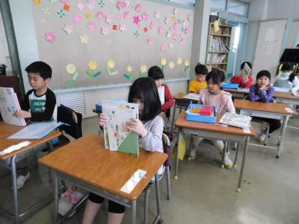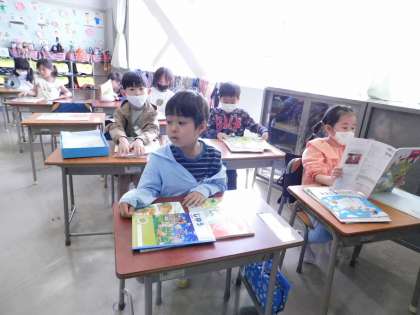 2組は教科書を配っていました。何が書いてあるのか、興味津々に読んでいました。