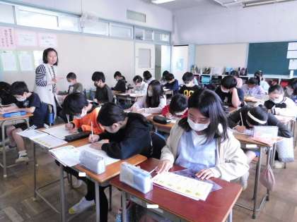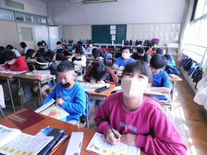 5年1組は国語の漢字ドリルを進めていました。字が上手です。