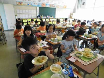 17日(月)から1年生の給食が始まりました。今日で5日目です。どの子もしっかり食べていますね。