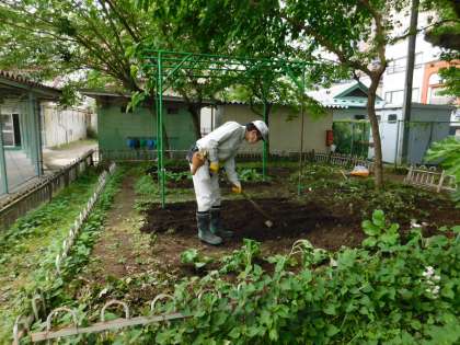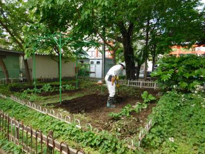 用務主事さんがミニ公園にある畑を耕してくれていました。2年生の畑だそうです。ありがとうございます。