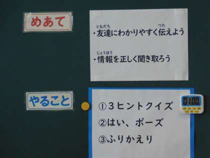 中学年の授業は「3ヒントクイズから当てよう」でした。ヒントの出し方が上手でした。