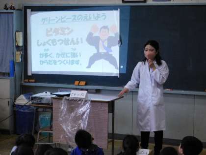 給食で出す「グリーンピースごはん」にいれるグリーンピースのさや向きをしてくれました。そのために、栄養士さんからお話を聞いています。