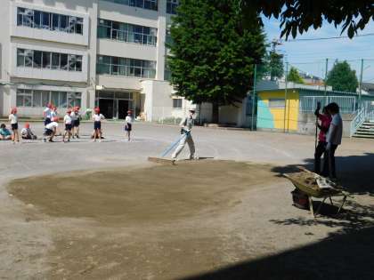 短距離走のゴール付近は水たまりができやすいため、用務主事さんが砂を入れ、丁寧にならしてくれています。