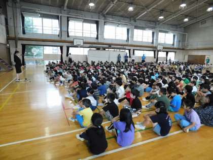 9日(金)に終わった教育実習ですが、13日(火)の全校朝会に来てもらい、子どもたちの前でお別れのあいさつをしてもらいました。