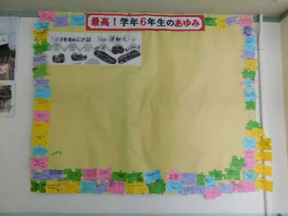 6年生の教室前に貼られていた掲示物です。「最高!学年6年生のあゆみ」と題して、一年間の取組が貼られていくようです。どんな内容になるか楽しみです。