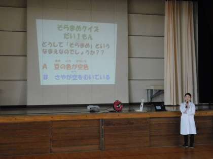 実際にむく前に、栄養士さんがそら豆クイズを出して、子どもたちの関心や意欲を高めました。