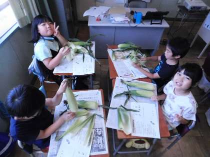 栄養士の先生から、トウモロコシの秘密をいっぱい教えてもらってから皮むきをしました。