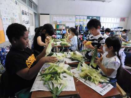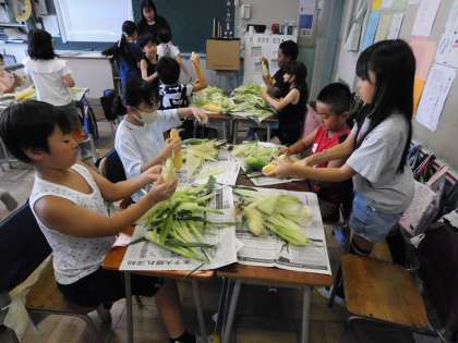 この日の、一小生全員の給食にでるトウモロコシなので、みんな真剣です。