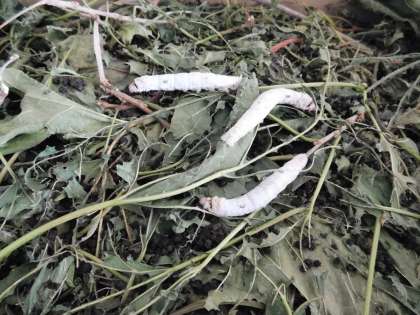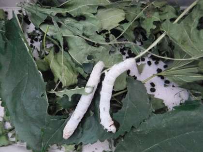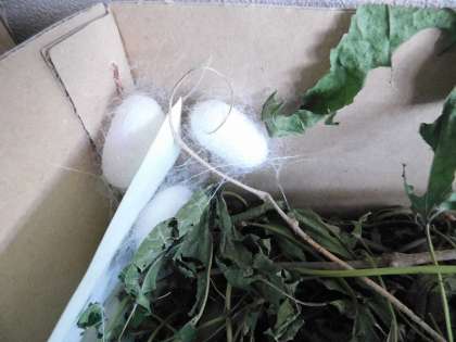 3年生の教室で飼われている「カイコ」さんです。もう繭になっているカイコもいますね。