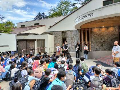 三本松園地で学年写真を撮り、森のホテルに着きました。開校式をしました。