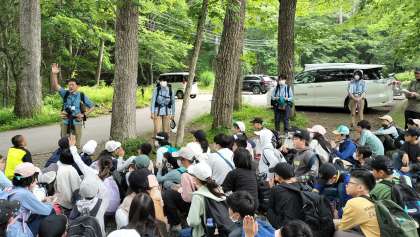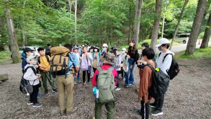 湯滝下から、ハイキングのスタートです。ガイドの方と挨拶をしています。