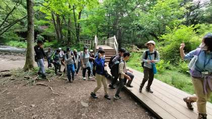 ハイキングスタートです。学年を4グループに分け、ガイドの方がグループに1人付きました。