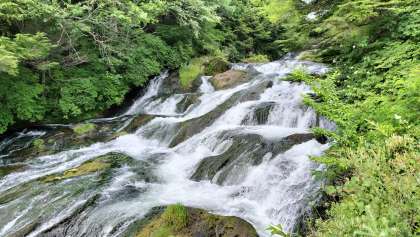 昼食も終わり、バスで龍頭の滝上から、遊覧船乗り場の菖蒲ヶ浜まで歩きます。
