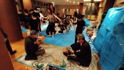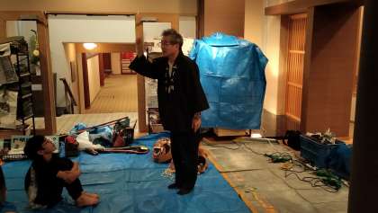 ふくべ細工の開始です。講師の先生から説明を受けてます。先ずは穴あけをしてもらいます。