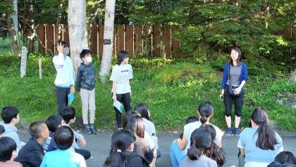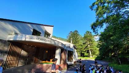 お早うございます。気持ちの良い朝です。奥日光は17度です。ホテル前で朝の会をしています。
