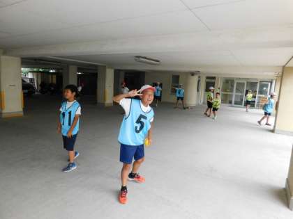 ピロティを使って、「校庭クラブ」が体を動かしていました。熱中症対策です。