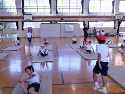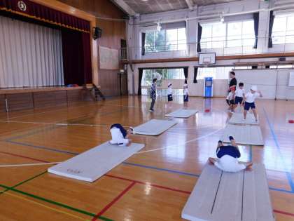 続いて、「前転がり」「後ろ転がり」も練習しました。子どもたちはたくさん運動することができて満足そうでした。