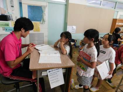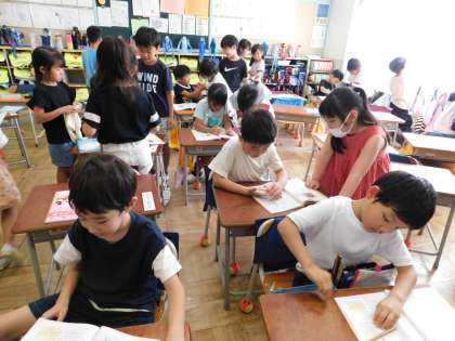 1年3組の授業風景です。算数の学習をしていました。丸をも洗った子は「ミニ先生」として、お友達にアドバイスしてくれていました。