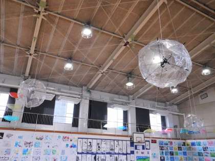 天井にはビニル傘を使った飾りが吊り下げられていました。