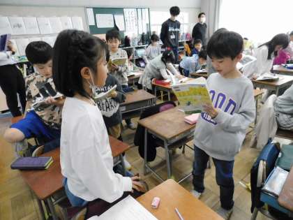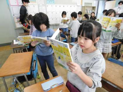 「さけがおおきくなるまで」の学習をしていました。列ごとに「。」読みをしたり、隣の子と「ペア読み」をしています。