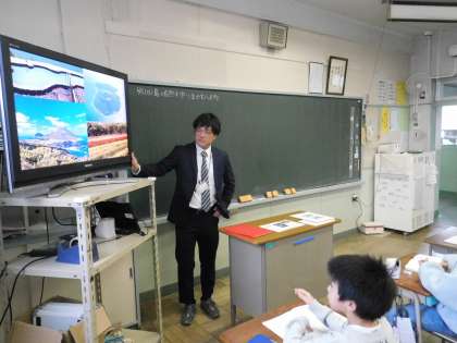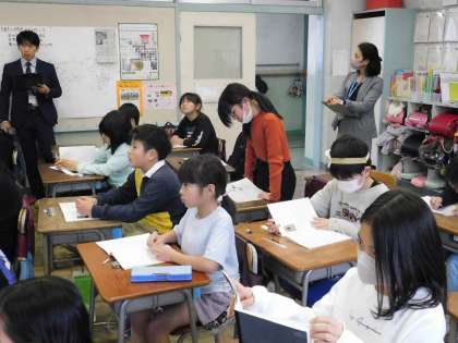 11日、4年1組の先生が教師道場の授業を行い、同じ班の先生方と教授が授業参観に来られました。