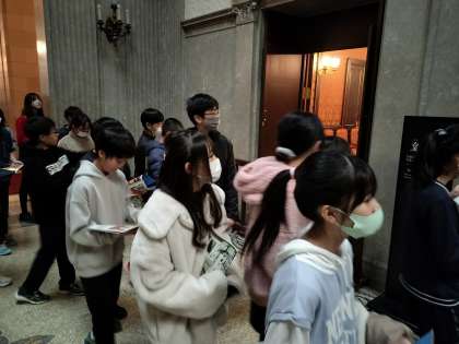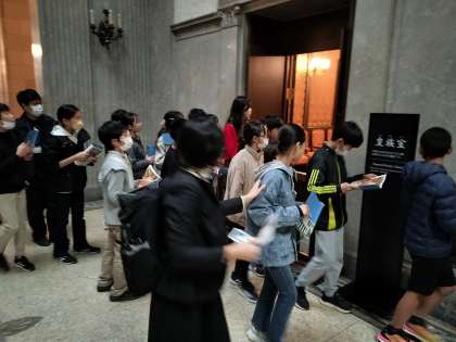 天皇がお休みになる御休所を見学しています。