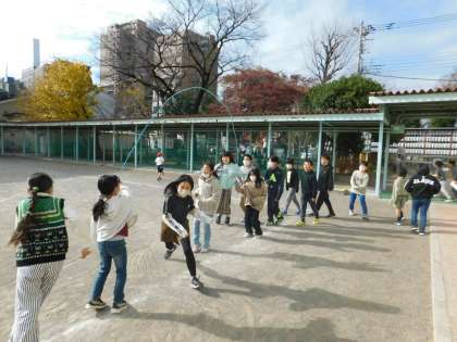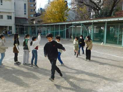 中休みの様子です。お日様も出て、朝よりグッとあたたかくなりました。4年生が大繩をしています。