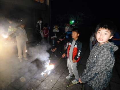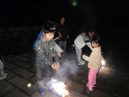 室内レクが終わり、外で花火をしました。