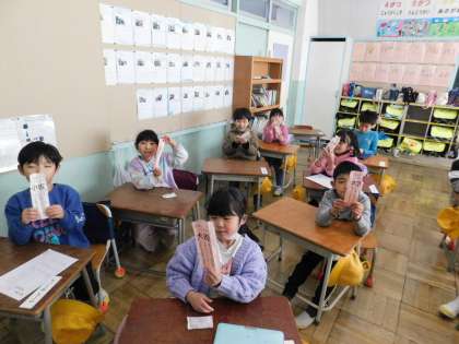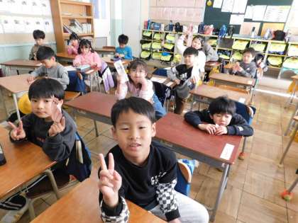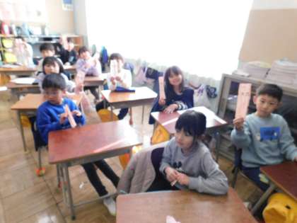 1年2組です。学年集会の後でした。1年生全員が先生手作りの「おみくじ」を引いたようです。嬉しそうに見せてくれました。