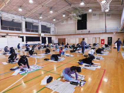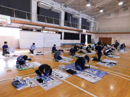校内書初め展に向け、各学年が席書きを行っています。きょうは5・6年生が実施しました。