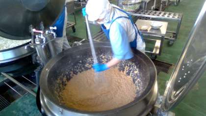 卵を釜に加えたらひたすら混ぜ続けます