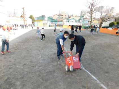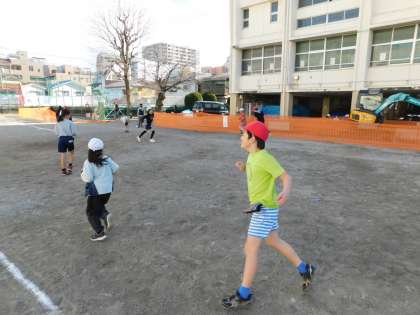 暖かい日で、校庭で活動するグループは楽しそうに運動していました。ライン引きも自分たちで行っています。