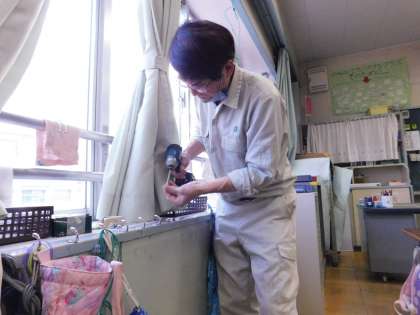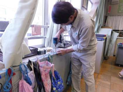箱を置くために、荷物かけを新しく作ってくれました。様々な場面で、教室に合わせて作業してくれるので、大助かりです。ありがとうございました。