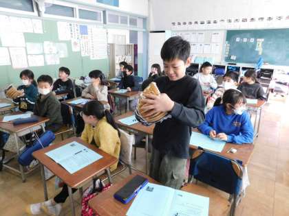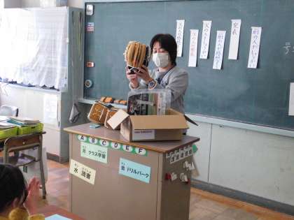 朝会後、昨日と本日の2日間、各学級でグローブに触れてもらいました。