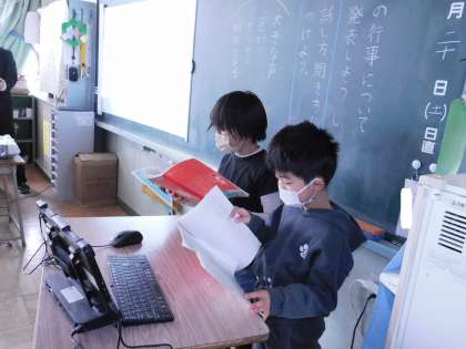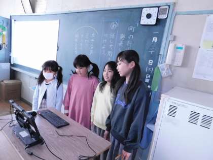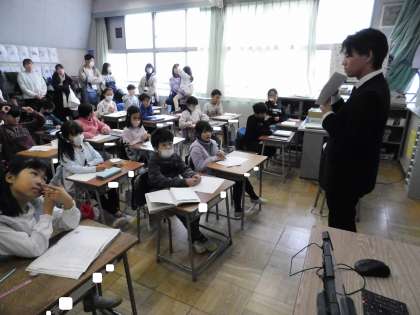 3年2組の授業です。「町(八王子)の行事」について発表していました。タブレットを使って資料を提示していました。
