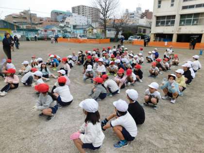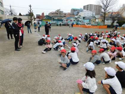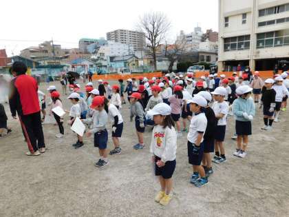 校庭では、1年生が「ミニ運動会」をしていました。ちょうど表彰式が終わったところです。