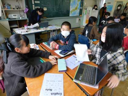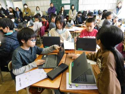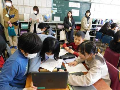5年1組の授業です。外国語の授業でした。タブレットを使いながら、「都道府県クイズ」を英語で出し合っていました。