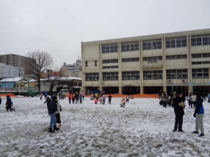 朝礼台の雪で、雪だるま作りです。