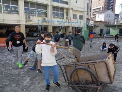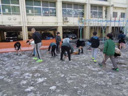 大雪から4日が経ちました。校庭では日陰の部分に氷状になった雪が残っていました。