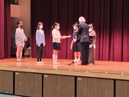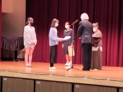 休憩後、青少対健全育成標語に入選した子たちの表彰がありました。本校からは4人が選ばれ、2人が表彰式に参加しました。