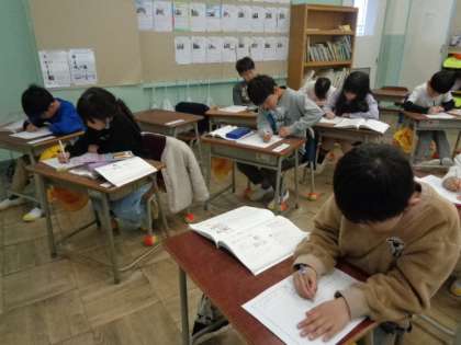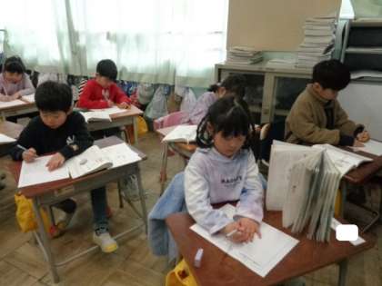 1年3組では、1年間の成長を振り返って、まとめの文章を書いていました。