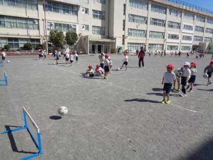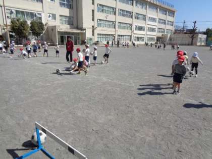 1年生が校庭で体育をしていました。3組はシュートゲームです。