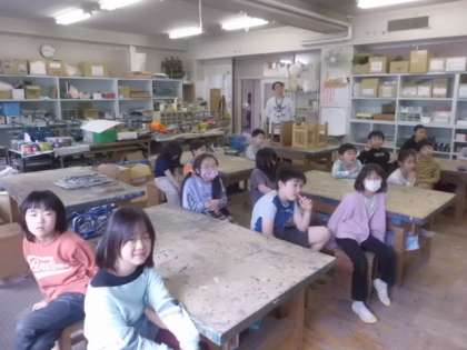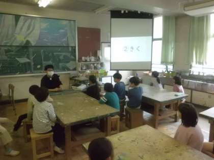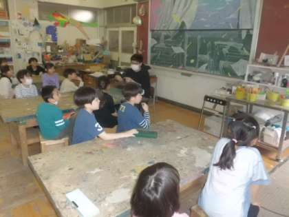 3年生が図工の授業を受けています。図工室の決まりや学習の進め方を、専科の先生から教わっています。