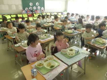 昨日から、1年生も給食が始まりました。1組はちょうど「いただきます」をするところでした。