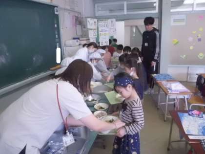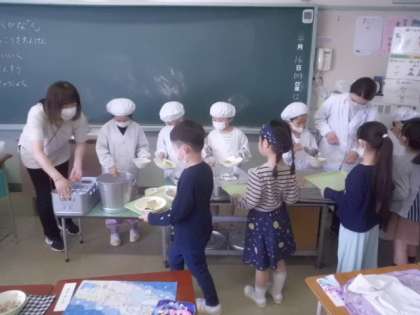2組は給食当番さんが配膳をしてくれていました。もらった子も、しっかり座って待っていました。