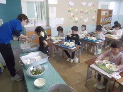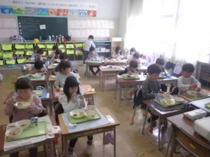 3組さんは食べている最中でした。1年生はお箸の使い方が上手な子が多くて、感心しました。すごいですね。
