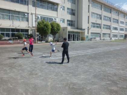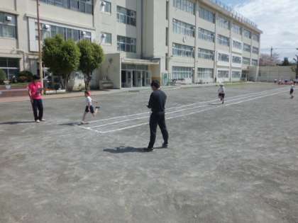 5年生(1・3組)が50m走のタイムを計っていました。
