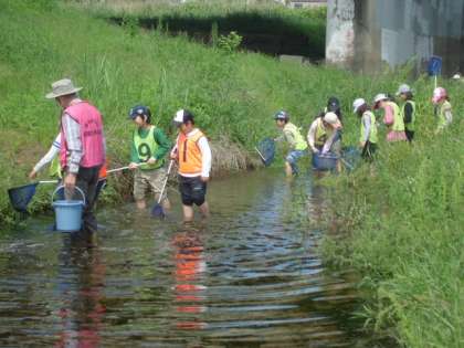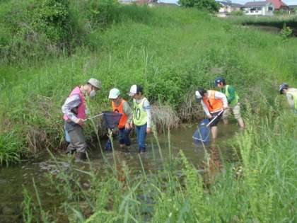 各自が手に網を持ち、水生生物を採集します。