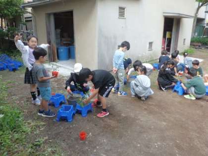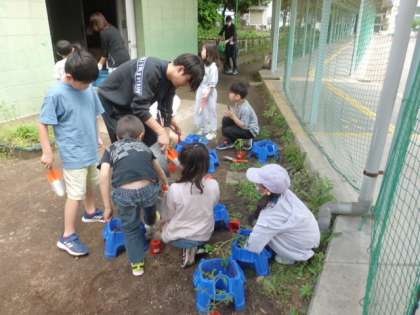 2年3組の子たちが、ミニトマトの苗を植えていました。