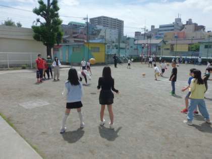 中休みの校庭の様子です。3年生と6年生が、それぞれ楽しそうにドッジボールをしていました。